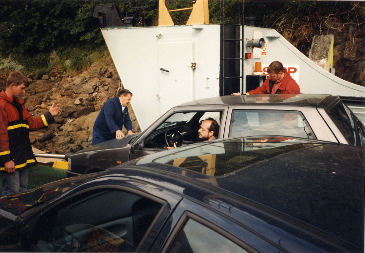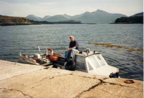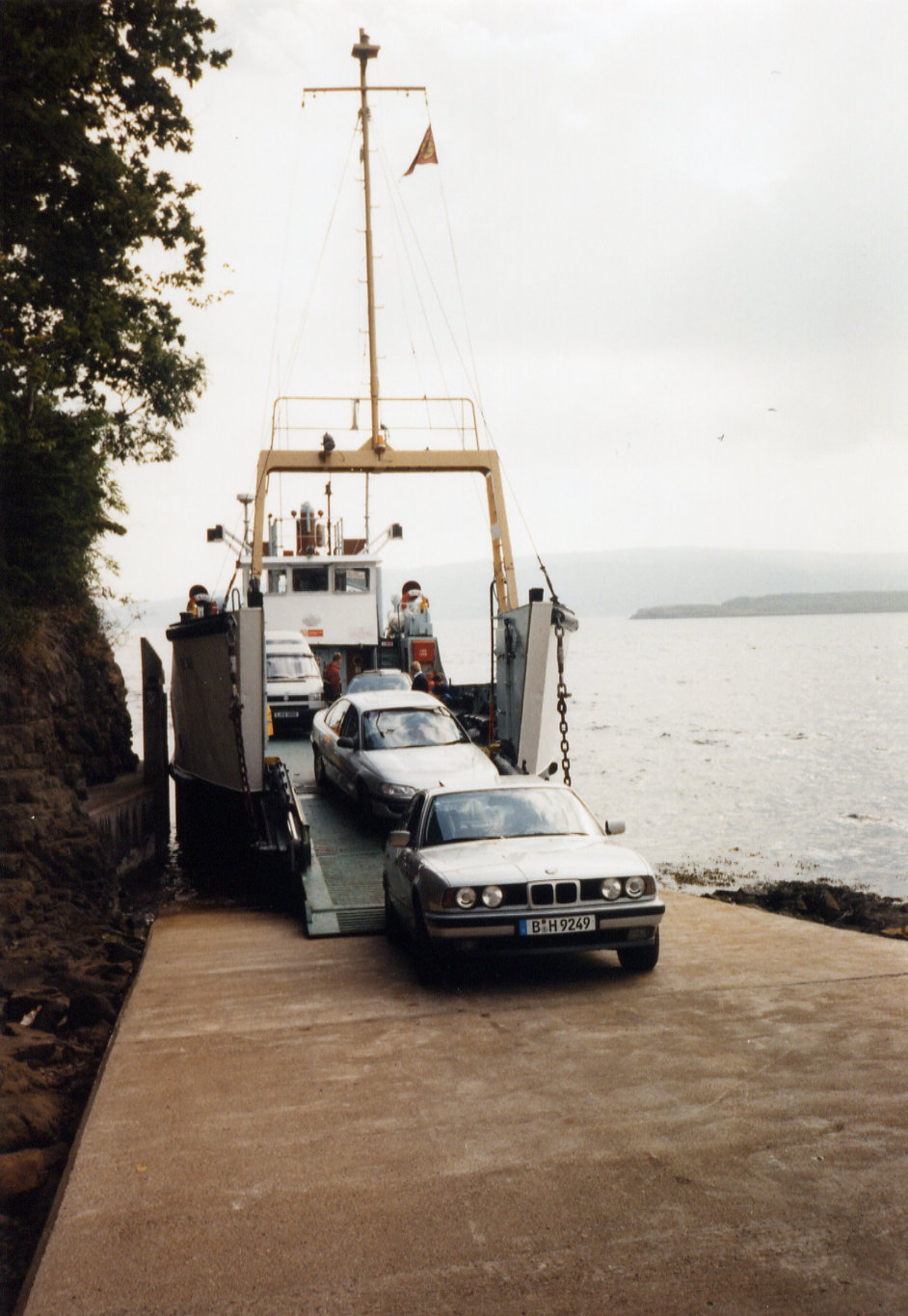 Die Fähre von Tobermory nach Kilchoan auf dem Festland bietet Platz für sechs Autos, und dies sehr knapp. Das Einschiffen ist höchst interessant. Man muß rückwärts auf das Boot fahren und wird zentimetergerecht eingewunken. Am schwersten hat es der Letzte, ein Fiat Uno aus Italien. Als er es endlich geschafft hat, gibt es Applaus von den Mitreisenden. Nachdem auch noch verschiedene Radfahrer ihr Gepäckmühsam verstaut haben, kann es endlich losgehen.
