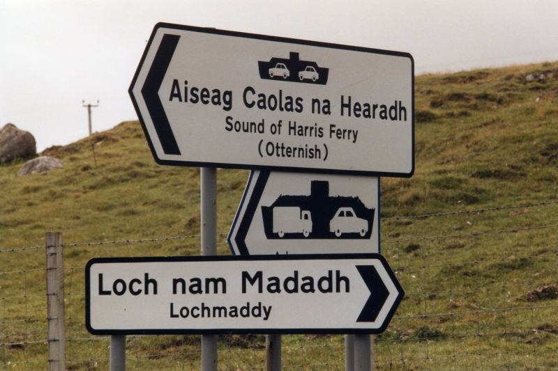 Nowdays the Outer Hebrides are a Gaelic stronghold. If I could easily link together Orkney and Shetland, Shetland and Norway, at first I didn't know what to link the Hebrides to. There wasn't a ferry link between those islands, either. Searching for Norn was out of question. However, I could find out that viking raiders finally settled in the Hebrides sometime around 840 AD, forming a large colony going as far south as the Isle of Man. They called it Sudreyar (southern settlement), in contrast with Nordreyar (Orkney and Shetland). The Hebrides remained Norwegian until 1266, when they where returned to Scotland. With unusual example of democracy, the islanders got the choice to remain Norse or become Scotts ..]