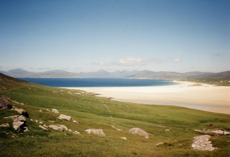 Things change considerably driving down to Valtos, where we got to an astonishingly beautiful beach, sheltered from land by the mountains and from the ocean by a couple of minor isles. The remoteness of this enormous expanse of sandy beach seemed extraordinary.