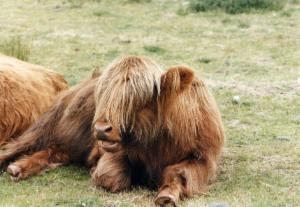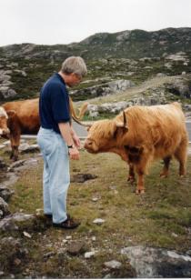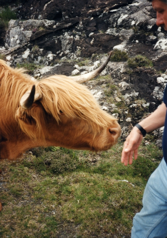 Vorher machen wir ein Picknick, und Ulrich fängt an, zwei Rinder mit Äpfeln zu füttern. Sie schließen ihn dafür so in ihr Herz, daß sie immer näher kommen und ihm freundlich die Hände lecken. Als wir zur Wanderung aufbrechen, läuft der Bulle (ein ganz netter!) noch eine Weile hinter uns her. Leider ist damit der schönste Teil des Spaziergangs auch schon vorbei.