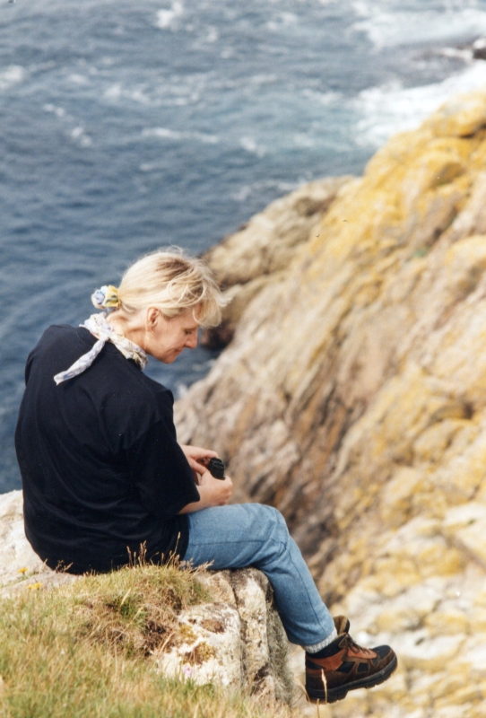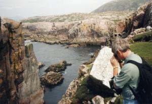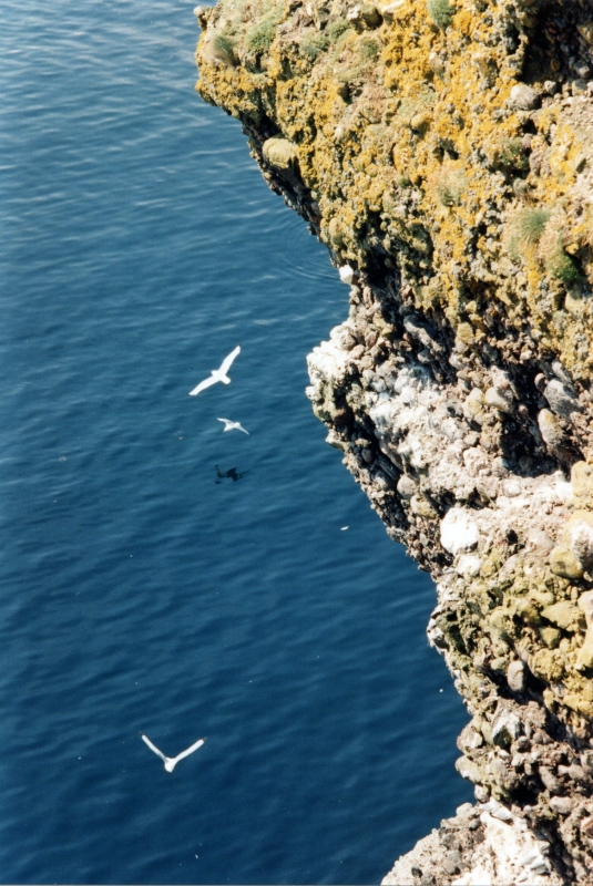 Lange sitzen wir am Rand einer Klippe und beobachten die Vögel: nistende Fulmars (Eissturmvögel), Kormorane und Black Guillemots (Gryllteisten). Interessant ist eine Herring Gull (eine große Möwe), die auf einem im Meer treibenden toten Seehund sitzt und sich genüßlich Leckerbissen herauspickt. Häufig versuchen auch andere Vögel ihr Glück, aber die Möwe behauptet ihren Platz.