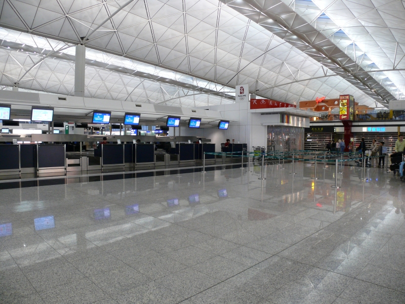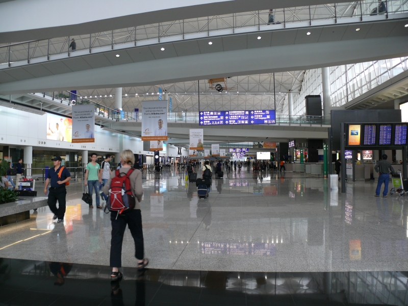 Nach einem gar nicht so schlechten Frühstück landen wir gegen 7.30 Uhr morgens halbwegs pünktlich, dafür aber recht hart in Chek Lap Kok, dem Flughafen von Hongkong. Der Pilot hat – wie es scheint – nicht realisiert, dass der Boden schon so nah ist und der Kontakt war dann etwas abrupt. Ein Hinweisschild auf den Ausgang fällt herunter, sonst ist aber nichts passiert.