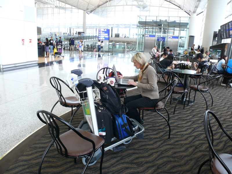 Unser Flug nach Sydney startet um 9.00 Uhr, um 5.35 Uhr kommt der Shuttlebus zum Flughafen. Frühstück gibt es im Hotel natürlich so früh noch nicht, aber wir bekommen Sandwiches und Wasser. Die Fahrt dauert etwa 30 Minuten. Gestern haben wir wesentlich länger gebraucht, aber um diese frühe Stunde sind die Straßen leer. Wir sind also rechtzeitig am Flughafen und ich habe Zeit, um noch etwas in meinen Reiseblog zu schreiben.