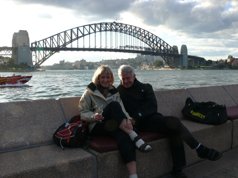 Mit Blick auf die Harbour Bridge in der einen Richtung und auf die Oper in der anderen sitzen wir auf einer mit Polstern belegten Mauer und genießen bei einem Glas Wein/einer Tasse Kaffee zusammen mit vielen anderen diesen Nachmittag in Sydney. Australien hat begonnen! Das müssen wir uns immer wieder bewusst machen, sonst vergessen wir leicht, dass wir uns ca. 20.000 km von zu Hause entfernt auf der anderen Seite der Erdkugel befinden.