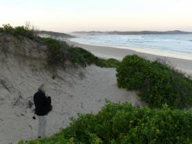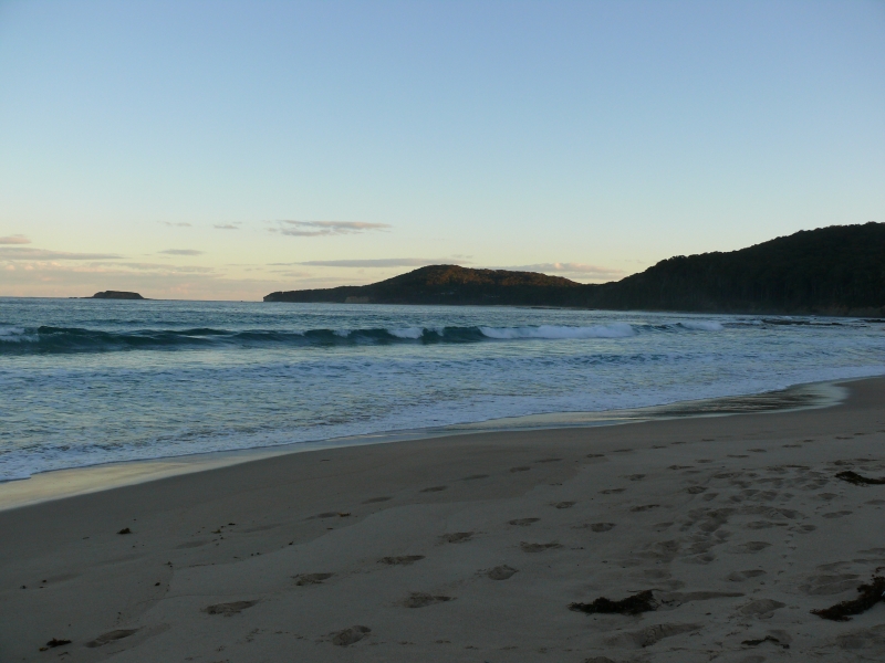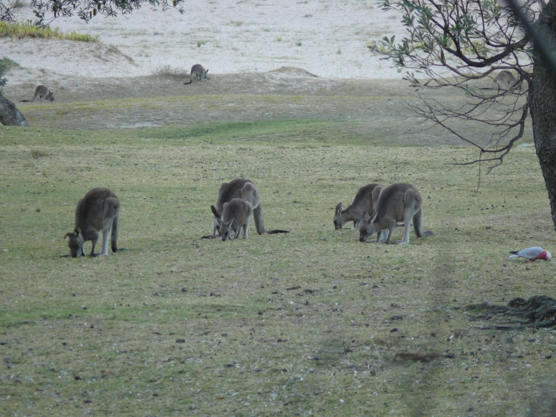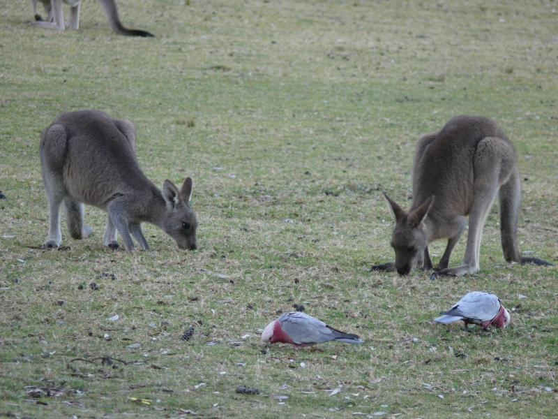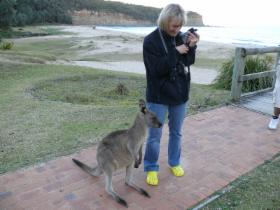 Nachmittags sind wir in Pebbly Beach, wo wir vielleicht über Nacht bleiben wollen, damit sich die 8 km lange Zufahrt über eine unbefestigte Straße auch lohnt. Pebbly Beach liegt im Murramarang National Park. Der Strand ist gesäumt von Wiesen, auf denen, gemeinsam mit einigen rosa Kakadus, friedlich eine große Gruppe Wallabies (ein Überbegriff für eine Anzahl kleinerer Känguru-Art) grast. Die Tiere sind gar nicht scheu, im Gegenteil: neugierig kommen zwei auf uns zu und interessieren sich besonders für meine heute Morgen neu erstandenen und darum noch leuchtend gelben Clogs. Auch ein Objektivtäschchen, das an meiner Kamera herunterhängt, wird ausgiebig beschnüffelt. Ich bleibe skeptisch, sie haben doch sehr lange Krallen an ihren Vorderpfoten.