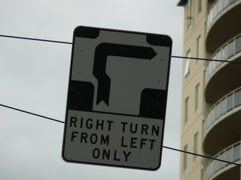 In Melbourne muss man zum rechts abbiegen auf die äußerste linke Spur fahren und sowohl den Gegenverkehr als auch den Geradeausverkehr der eigenen Richtung abwarten, bevor man fahren darf. Analog in Deutschland würde das bedeuten, dass man zum links Abbiegen auf die äußere rechte Spur fahren müsste.
