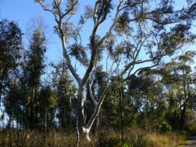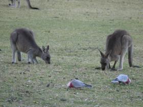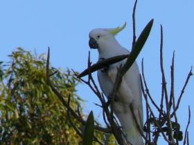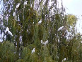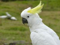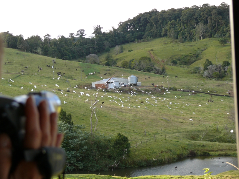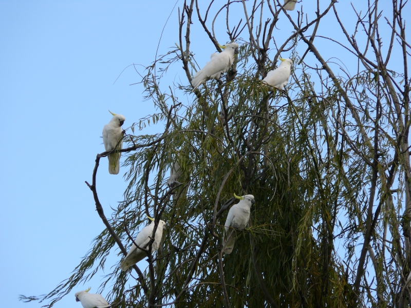 Auf dem Weg zum Broken River, einem guten Beobachtungsort, sehen wir auf einer Wiese Hunderte von großen, weißen Kakadus (Sulphur-crested Cockatoo) sitzen, wie bei uns vielleicht Möwen auf den Feldern während der Ernte. Mit lautem Geschrei fliegen sie auf, wenn man ihnen zu nah kommt und bevölkern dann die umliegenden Bäume.