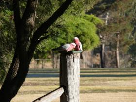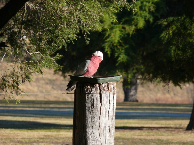 Auf dem Campingplatz ist eine Gruppe rosa Kakadus beim Frühstück. Laut kreischend wecken sie uns, sobald es hell wird.