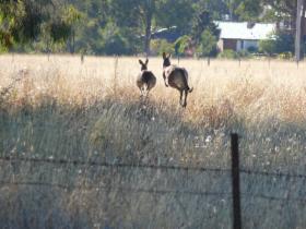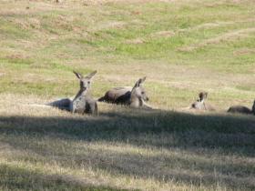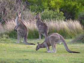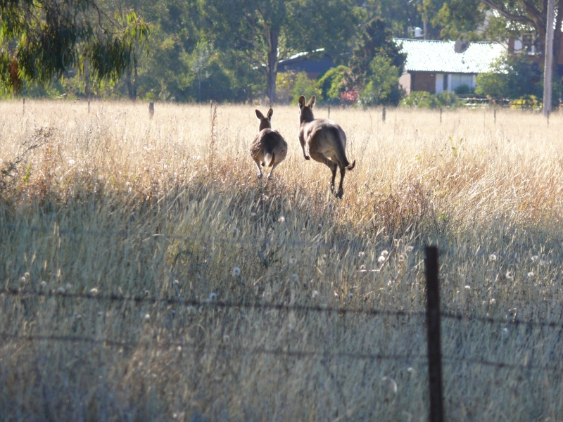 Gegen 9.30 Uhr machen wir uns auf den Weg zurück zum Princess Highway, der A1, auf der wir weiter nach Süden fahren. In einem kleinen Örtchen hat gerade eine Horde Wallabies die Vorgärten erobert!