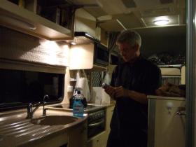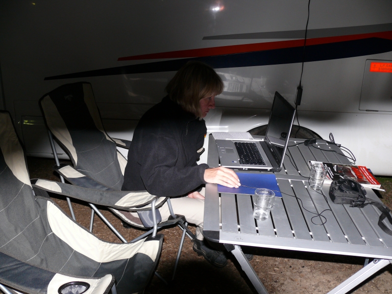 Die Rezeption ist natürlich nicht mehr besetzt, aber es gibt eine Rufanlage, und zehn Minuten später ist jemand da, der uns einen der letzten freien Stellplätze zuweist. Wir lassen die Rollos an unserem Auto herunter, machen alle Lichter an und sperren damit die Dunkelheit und die anderen Leute aus. Der gemütliche Teil des Abends beginnt: Während Ulrich das Essen kocht, übertrage ich die Fotos vom Tag auf das Laptop, schreibe Tagebuch und bereite die Einträge für meinen Blog vor. Es ist sehr angenehm, dass wir zwei Sitzgruppen mit Tischen haben. Da kann man sich gut ausbreiten. - Und ab und an gebe ich sogar das Laptop für Ulrich frei!