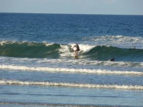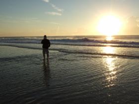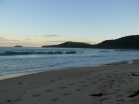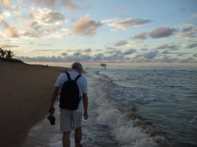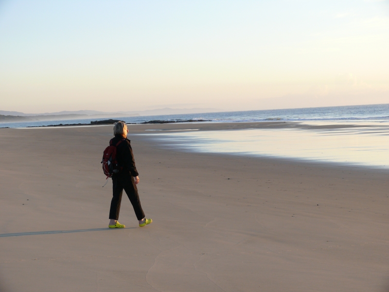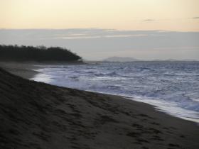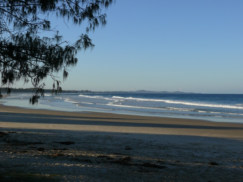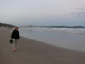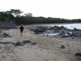 Unser Campingplatz (Tannum Beach Caravan Village) liegt fast direkt am Meer und so beschließen wir den Tag (d.h. den "Tageslichttag") mit einem Strandspaziergang. Wir sind anfangs nicht direkt am Pazifik, sondern in einer Flussmündung. Der Strand ist dort nicht so schön, es gibt viele Mangroven, und der Sand ist mit kleinen Kieseln durchsetzt, die einem ständig in die Schuhe geraten. Erst als wir ans Meer kommen, wird es schöner. Um den gesamten Weg am Wasser entlang zurück zu gehen, reicht das Tageslicht nicht mehr aus, zudem haben wir ein wenig Angst, dass es in der Flussmündung Krokodile geben könnte. Darum gehen wir das letzte Stück an der Straße entlang, einer Art Strandpromenade.