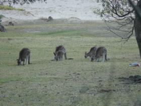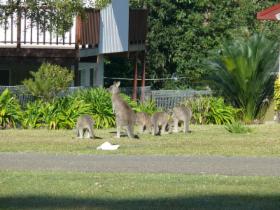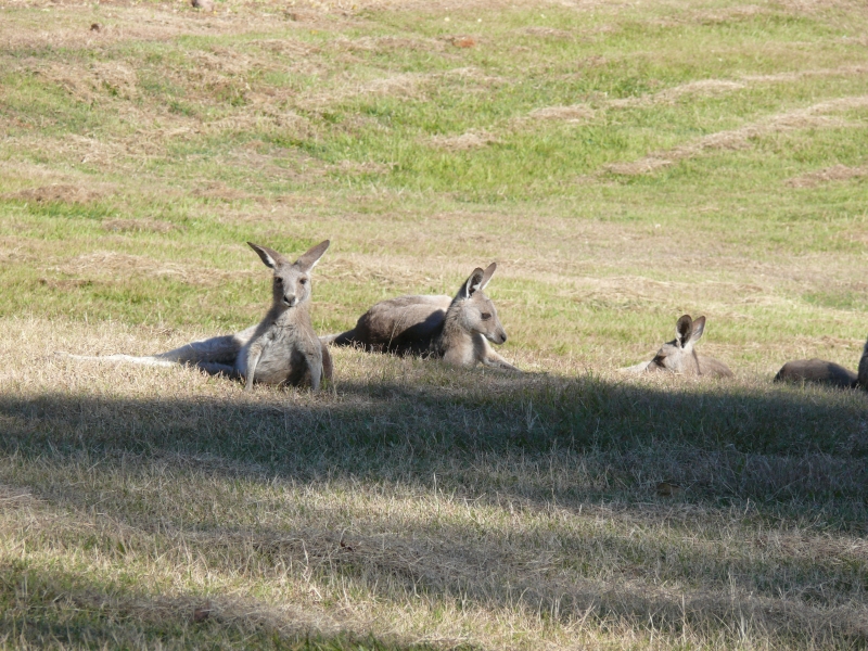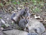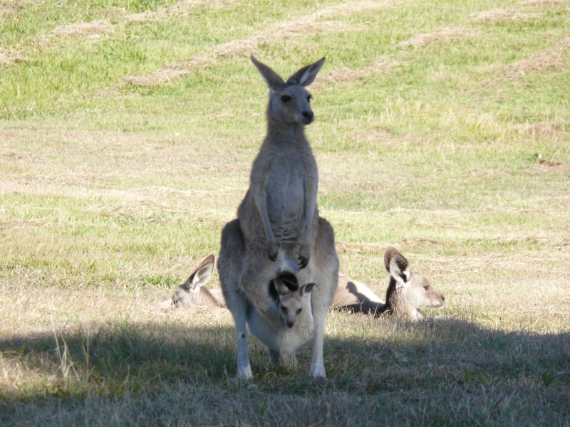 Netter sind da schon die Wallabies, die am Wegrand stolz ihren Nachwuchs präsentieren. Diese hier haben wir auf einer kleinen Wiese zwischen Wohnhäusern entdeckt.