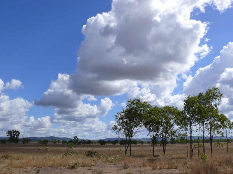 Hinter Rockhampton gehen die Weiden über in Buschland mit lockerem Baumbestand. Weit verstreut sieht man Rinder und Pferde grasen, die Tiere haben wirklich unendlich viel Platz. Hier kommt mir immer wieder der Begriff "Weites Land" in den Kopf. Ortschaften gibt es nur wenige, und wer schon in Rockhampton einen eher leeren Tank hatte, kann vielleicht Probleme bekommen. Die nächste Tankstelle ist über 100 km weit entfernt. Nicht, dass dies hier schon mit dem wahren Outback zu vergleichen ist, aber ich bekomme eine vage Idee von der Größe des Landes. Australien ist mit ca. 7.700.000 km² mehr als 20x so groß wie Deutschland (ca. 350.000 km²), hat aber nur ca. 20,5 Millionen Einwohner gegenüber 82,4 Millionen in Deutschland.