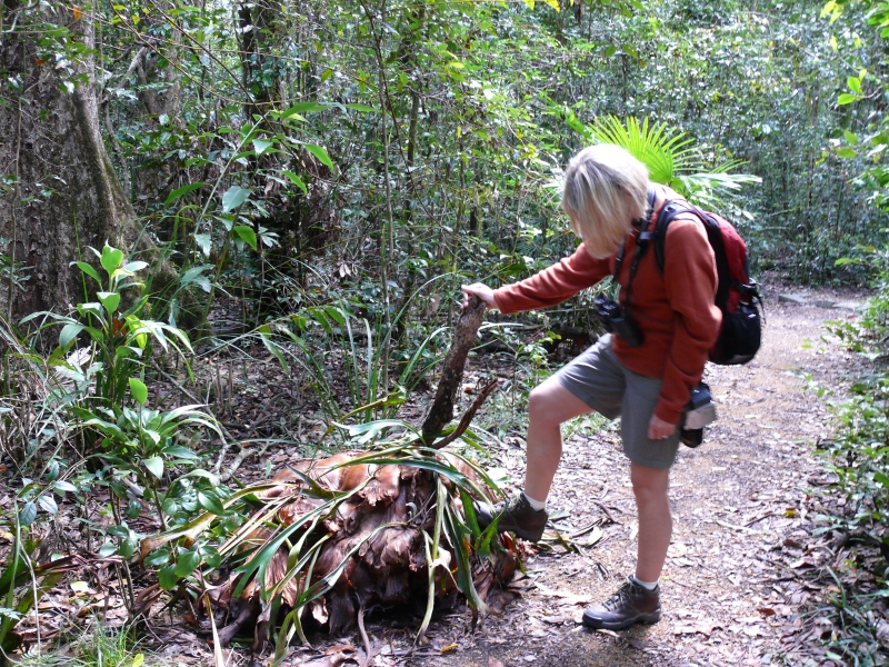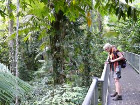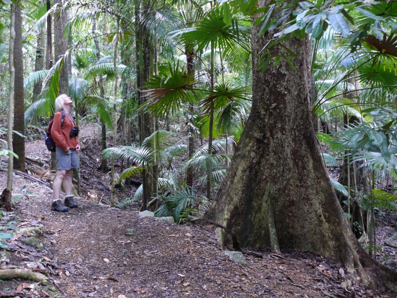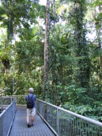 Ein paar Kilometer weiter nehmen wir gleich das nächste Touristenangebot in Anspruch. Im Daintree Rainforest Discovery Center gehen wir – bewaffnet mit einem sogenannten Audio-Guide – über Boardwalks auf verschiedenen Ebenen durch den Regenwald. Ich bin zunächst skeptisch, – "Da können wir ja auch zu Hause durch den Botanischen Garten gehen!" – muss mich dann aber eines Besseren belehren lassen. Diese Tour ist äußert interessant und informativ, wir erfahren viel über den Lebensraum Regenwald.