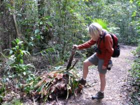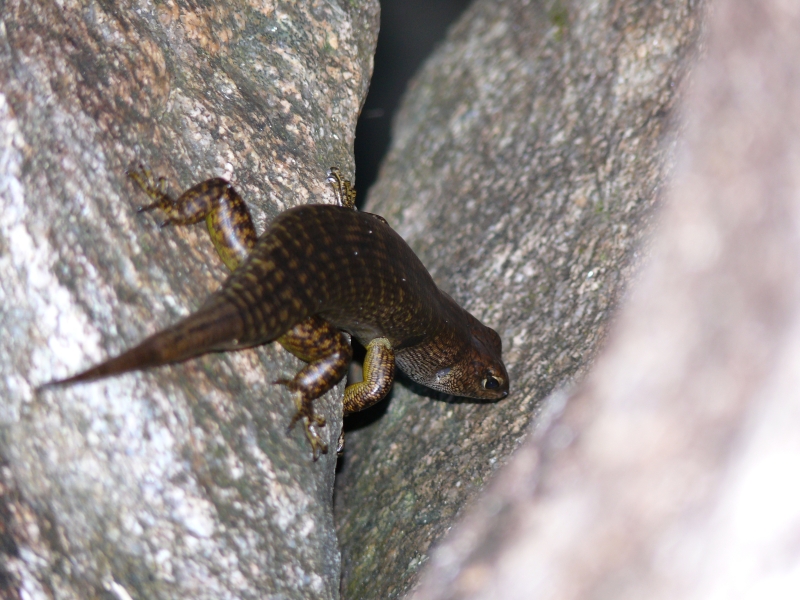 In der Finch Hatton Gorge gehen wir noch einen zweiten Trail bis zu den Araluen Wasserfällen. Hier machen wir eine kleine Rast. Ulrich entdeckt eine Eidechse, die lang genug stillhält, um ausgiebig fotografiert zu werden.