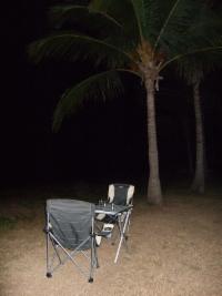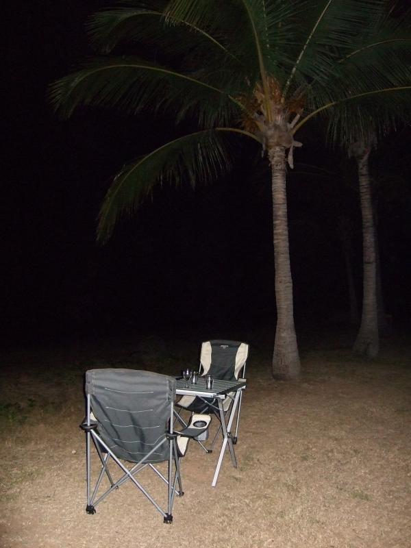 Zum Übernachten fahren wir nach Rolling Stone, ca. 60 km nördlich von Townsville. Der Campingplatz liegt direkt an der palmengesäumten Beach. Nach einem Strandspaziergang stellen wir unseren Tisch und die Stühle zwischen zwei Palmen auf und genießen so äußerst stilvoll den Tagesausklang.