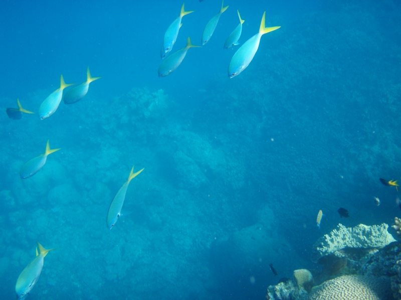 Umso mehr sollte man genießen, was man zu sehen bekommt. Ich habe leider Probleme mit dem Atmen durch den Schnorchel und werfe darum immer nur kürzere Blicke unter Wasser. Aber Ulrich ist mit einer geliehenen Unterwasserkamera unermüdlich unterwegs. Die Artenvielfalt, die man so kurz unter der Wasseroberfläche schon wahrnimmt, ist unglaublich und faszinierend. Auch das Gefühl, zwischen so vielen Fischen herumzuschwimmen, ist ein ganz besonderes. Man kommt sich vor wie in einem Aquarium, ist aber tatsächlich im Pazifik weit weg vom Festland!