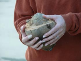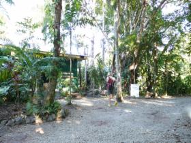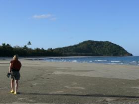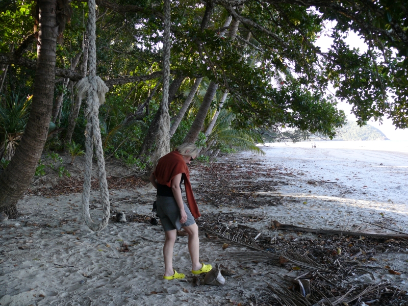 Ein kleines Stück weiter, am Cape Tribulation, endet die ausgebaute Straße. Weiter in Richtung Cooktown gelangt man nur mit Allradfahrzeugen. Wir übernachten auf dem Cape Trib Campground. Hinter dem Auto steht eine Bananenstaude. Der Strand ist hier von Kokospalmen gesäumt und es liegen viel Kokosnüsse herum. Eine nehmen wir mit für den Nachtisch. Ulrich befreit sie schon am Strand zur Hälfte von ihrer Hülle.