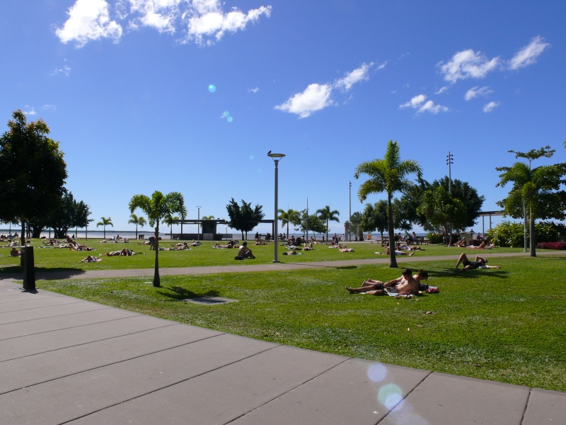 ... und fahren mit einem Taxi in die Stadt. An der Esplanade in Cairns, einer Promenade am Meer, liegen die Leute auf der Wiese und sonnen sich.