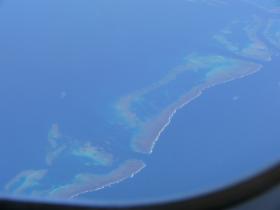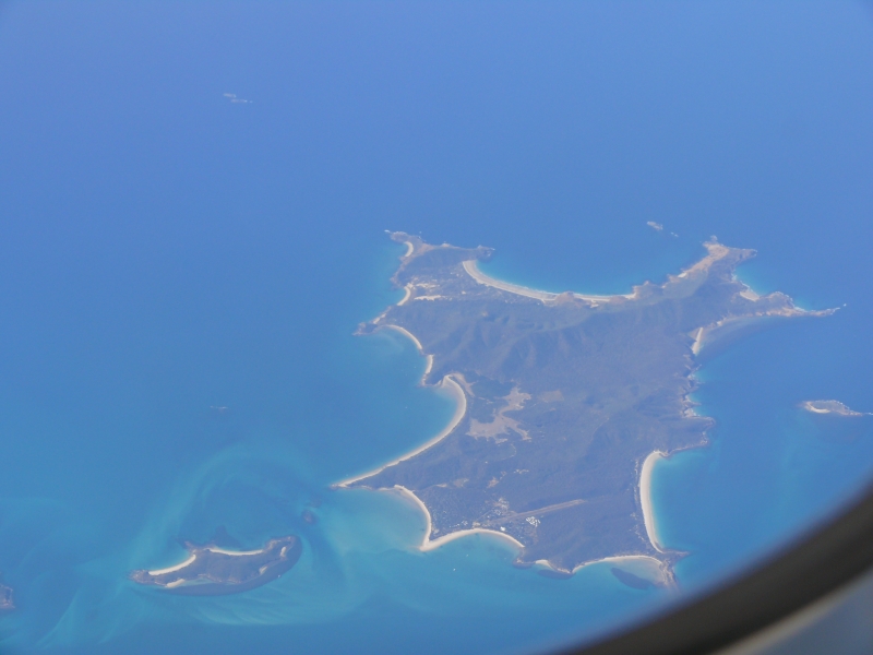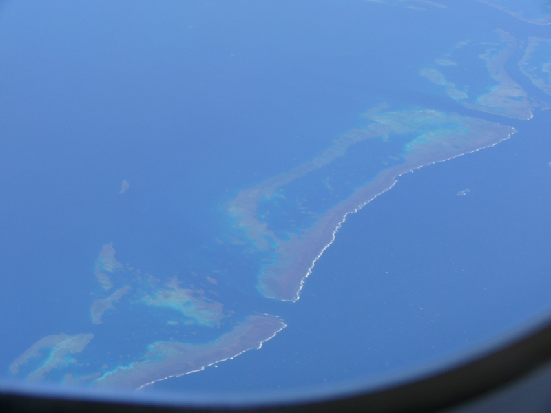 Der Nachteil an Australien ist, dass man ca. 20.000 km überwinden muss, um dorthin zu gelangen. Das kostet zweieinhalb Tage und mehr als 20 Stunden reine Flugzeit pro Strecke. Beim Rückflug kommen noch ein paar Stunden mehr hinzu. Wir fliegen nämlich von Cairns aus nicht direkt nach Hongkong, sondern zunächst nach Brisbane, d.h. erst einmal in die falsche Richtung. Entschädigt werden wir allerdings durch fantastische Blicke auf die australische Pazifikküste, die vorgelagerten Inseln und auf das Great Barrier Reef. Ein schöner letzter Gruß!