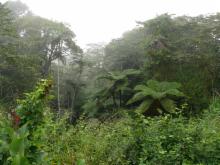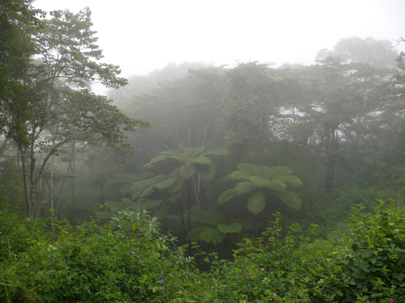 Nachdem die Sonne den Nebel langsam aufgelöst hat, (Beim Frühstück war es noch lausig kalt!) erkunden wir den Regenwald auf einer Wanderung etwas genauer. Die Natur bietet hier solch eine Vielfalt von Pflanzen, wie man es sich in einem deutschen Wald gar nicht vorstellen kann. Alles reckt sich zum Licht, die größeren Bäume werden von unzähligen Epiphyten als Halt genutzt und Kletterpflanzen ranken sich an ihnen zur Sonne empor. Im Lebensraum Regenwald stellt jeder Baum noch einmal einen eigenen Lebensraum für viele andere Pflanzen und auch Tiere dar. Bis zum Boden dringt die Sonne nur an ganz wenigen Stellen. Immer wieder bleiben wir stehen, um genau hinzuschauen oder den vielfältigen Vogelstimmen zu lauschen. Zu sehen bekommt man die Vögel allerdings so gut wie gar nicht.