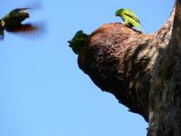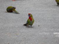 Nun aber zurück zum eigentlichen Tagesziel. Das Visitor's Center liegt inmitten des Nationalparks. Erreichbar ist es über die einzige Straße, die in den Park hinein führt und auch dort endet. Weiter kommt man mit dem Auto nicht, es gibt aber diverse Trails zwischen einem und über 40 km Länge. Gleich bei der Ankunft werden wir von bunten Sittichen überfallen. Insbesondere die Leute, die Essbares in der Hand haben, können ihnen nicht entkommen. Sie sind wirklich so aufdringlich wie schon im Reiseführer beschrieben!