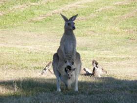 Am Nachmittag machen wir uns auf den Rückweg. Wir haben nur ein Tagesticket und bis zum Sonnenuntergang (17.30 Uhr) müssen wir den Nationalpark wieder verlassen haben. Wir wollen gemütlich zurückfahren und noch einige Stichstraßen anschauen, immer in der Hoffnung, doch all die angekündigten Tiere zu sehen. Außer den Sittichen am Visitor's Center war der Ausflug in Bezug auf die Fauna bisher noch nicht so ergiebig. Der Rückweg entschädigt dann allerdings deutlich. Ganz nah sehen wir grasende Riesenkängurus und einen Wombat, dazu an der 5-Mile-Street viele verschiedene Kängurus, die rechts und links der Straße grasen und hin und her hüpfen. Man muss sehr aufpassen, zumal es jetzt auch schon relativ dunkel ist.
