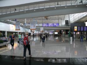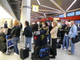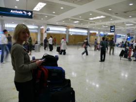 Beim Sicherheitscheck müssen wir (mal wieder!) Federn lassen. Wir haben vergessen, unsere Bad-Utensilien aus dem Handgepäck herauszuräumen, und prompt werden zwei Nagelscheren, eine Nagelzange und Haargel einkassiert. Dafür übersehen sie netterweise mein Taschenmesser, das auch im Kosmetikbeutel war.