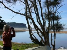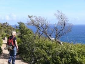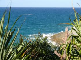 Nachdem wir uns ausgiebig mit ihnen beschäftigt haben und mit Sandwiches versorgt sind, entscheiden wir uns für einen der kürzeren Wege zur Squeaky Beach. Wir gehen zunächst durch einen Wald und dann entlang der Klippen hinunter zum Strand. Es bieten sich fantastische Blicke auf den Pazifik, der sich mit hohen Wellen und entsprechender Brandung präsentiert. Die Sonne scheint mittlerweile vom wolkenlosen Himmel, war doch heute Morgen noch alles grau in grau, und geregnet hat es sogar. Nun aber ist alles perfekt, und wir sitzen auf den Klippen und genießen die Aussicht.