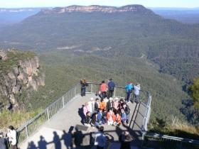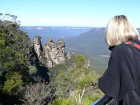 Die Sache mit dem Frühstück gestaltet sich da schon schwieriger. Die Straße, auf der wir den Highway gen Nationalpark verlassen, ist nicht die ruhige Nebenstrecke, die wir erwartet haben, sondern eine breite Überlandstraße, die durch große Farmgebiete mit entsprechend herrschaftlichen Häusern führt. Alles ist eingezäunt und es bietet sich kein Platz für ein Picknick an. Auch der Blue Mountains National Park erschließt sich für uns nicht besonders leicht. Die Straße, die die Highlights verbindet und in den Reiseführern angepriesen wird, entpuppt sich als drei- bis vierspuriger Highway, an dem ein Ort in den anderen übergeht. Darüber hinaus gibt es haufenweise Baustellen. Nur von Natur und Zufahrten in den Nationalpark ist herzlich wenig zu sehen. Vereinzelt gibt es Hinweisschilder, aber manche von diesen Wegen führen ins Leere. Dagegen sind die Zugänge zu den Attraktionen des Parks sehr gut ausgebaut, und sie verfügen über eine tadellose touristische Infrastruktur. Der Preis sind Busladungen von Besuchern, selbst jetzt noch im australischen Spätherbst. Ich mag mir gar nicht ausmalen, wie es hier wohl im Sommer zugeht. Wir schaffen es offensichtlich nicht, das richtige Gefühl für diesen Park zu entwickeln.
