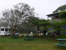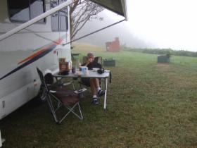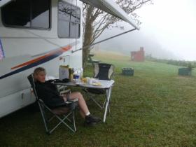 Zurück auf dem Campingplatz stellen wir Tisch und Stühle hinaus, um draußen zu essen. Das schaffen wir zwar gerade noch, aber dann wird es zu kalt. Von den Bergen zieht Nebel auf, und bald ist das ganze Tal mit weißer Watte gefüllt. Der Eungella macht seinem Namen alle Ehre.