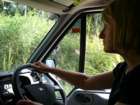 Eigentlich wollten wir früh los, aber es dauert halt seine Zeit, bis wir wirklich abfahrbereit sind, und es ist schon 9.30 Uhr, als wir tatsächlich vom Platz fahren. Ulrich darf gleich all seine Fahrkünste zeigen: Er muss rückwärts zwischen rechts und links abgestellten Autos hindurch und es ist nicht viel Platz! Man bedenke: Er hatte noch keine Zeit, sich auf die Breite des Autos einzustellen; er hat keine gute Sicht nach hinten und muss das Bild in den Außenspiegeln mit dem Bild der Rückfahrkamera koordinieren; er sitzt auf der rechten Auto-seite und muss mit der linken Hand schalten. Dazu stehen noch die Besitzer der anderen Autos am Wegrand und beobachten die Aktion. Mich macht das beim Zuschauen schon nervös, aber Ulrich hat keine Probleme – sagt er zumindest.
