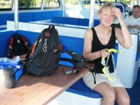 Ein Zubringerbus holt uns am Campingplatz ab und bringt uns zur Pier. Mit uns steigen noch zwei Deutsche mit ihrem 10 Monate alten Sohn Finn ein. Beide sind erfahrene Taucher und Australienreisende und sind mit einem Zelt unterwegs. Sie erzählen uns übrigens, dass es im (australischen) Sommer hier sehr voll sei und man sogar die Campingplätze vorbuchen müsse. Das würde uns ja gar nicht gefallen.