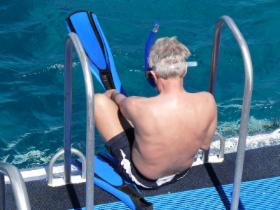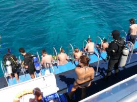 Neben den "Schnorchlern" sind auch einige Taucher an Bord. Sie haben in der Nähe des Bootes Hammerhaie gesehen.