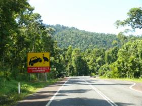 Wir fahren noch bis zum Ende der ausgebauten Straße und ein Stück darüber hinaus – dann begeben wir uns endgültig auf den Weg zurück nach Süden. Wir fahren langsam, um vielleicht doch noch einen Cassowary (sehr auffällige Laufvögel, die bis zu 1,70 m groß werden können und nur noch an wenigen Stellen in Australien und Neu Guinea leben) zu Gesicht zu bekommen, leider vergeblich.