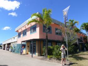 Wir schaffen es heute tatsächlich noch bis Airlie Beach. Hier hat unser Neffe Toby bei Fantasea Cruises gearbeitet, als er in Australien war. Airlie ist ein quirliges Örtchen, das von Tauch- und Schnorcheltouren zum Great Barrier Reef lebt. Die Hauptstraße ist gesäumt von Souvenirläden und Agenturen für Bootsausflüge. Man sieht hier viele junge Leute, es gibt ein Backpacker-Hotel und diverse Bars und Restaurants. Alles macht einen netten und sympathischen Eindruck. Nachdem wir unseren Schlafplatz im Big4 Cove gesichert und im Lebensmittelladen unsere Vorräte ergänzt haben, fahren wir zurück in den Ort und essen bei KC's Steak and Seafood Barramundi. Der Barramundi, der König der Fische, wie er in Australien genannt wird, ist eine Barschart und gehört zu den Edelfischen. Er lebt im gesamten Indopazifik und kann bis zu 2 m lang und etwa 60 kg schwer werden. Er schmeckt sehr gut! Nach dem Essen bummeln wir noch ein wenig die Straße entlang und schauen dem Treiben in den sich langsam füllenden Kneipen zu.