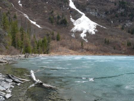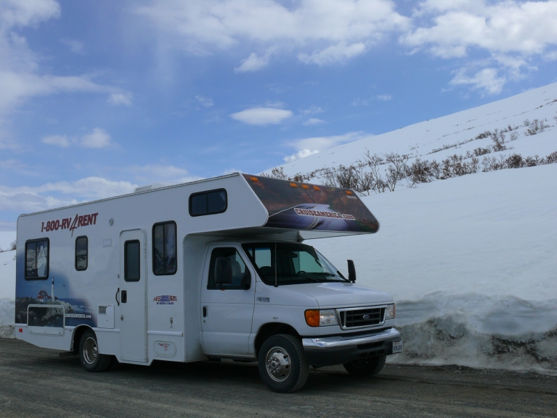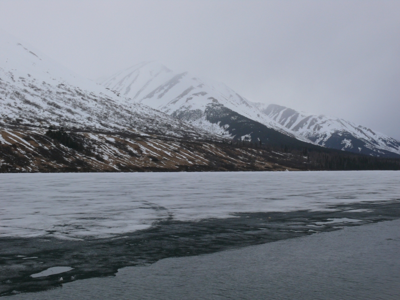 Kurz vor Palmer verlassen wir den Highway, um einen Bogen über den Hatcher Pass zu fahren. Das soll eine besonders schöne Route sein. Leider ist dieses Unternehmen nicht von Erfolg gekrönt, denn der Pass ist noch gesperrt, und wir müssen wieder zurück fahren. Aber auch die Anfahrt zum Pass bis zu einer alten Silbermine, der Independence Mine, ist sehr schön. Hier ist zur Abwechslung noch einmal richtiger Winter, und es liegt teilweise hoher Schnee. Auf dem Campground heute Abend in Wassila am Lake Lucille können wir uns entscheiden zwischen einem abgeschirmtem Stellplatz zwischen Bäumen oder einem offenen mit Blick auf den See. Wir entscheiden uns für den Ausblick.