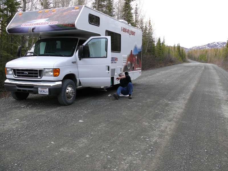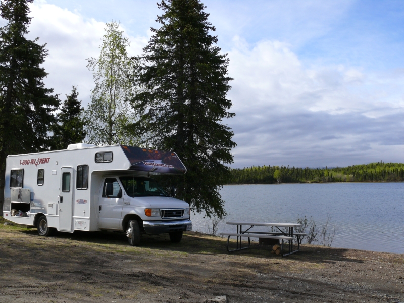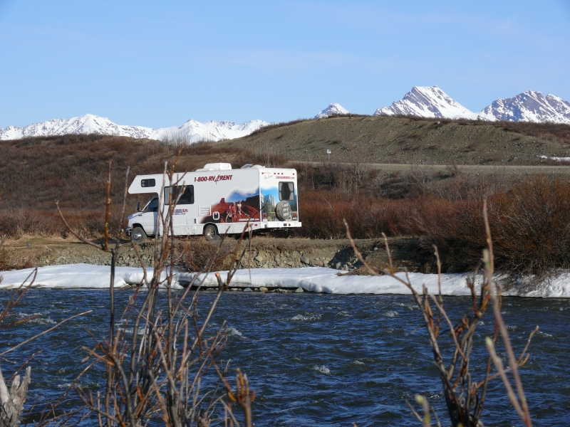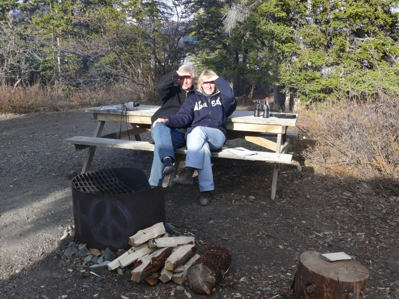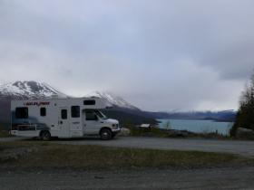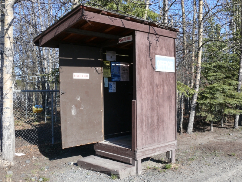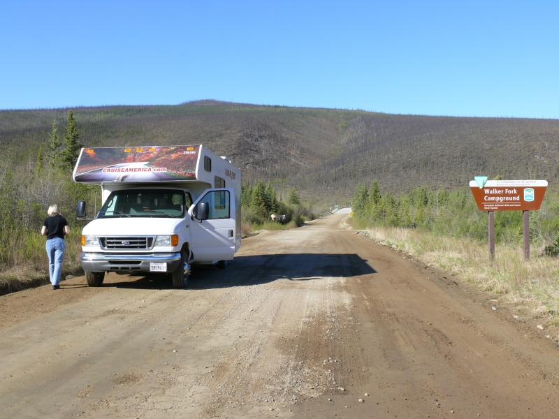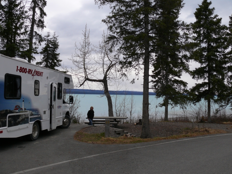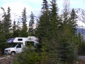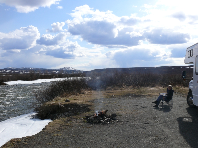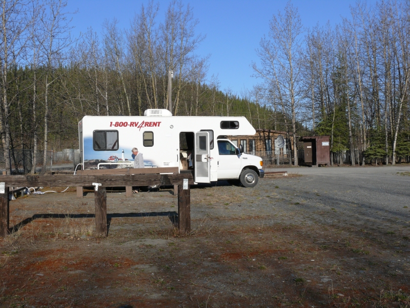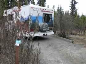 Dieser Campground ist - wie viele andere in Alaska - staatlich betrieben. Es gibt hier keinen Service (Wasser, elektrischen Anschluss, o.ä.), aber mit dem Wohnmobil, das mit Dusche und Stromgenerator ausgestattet ist, sind wir ja unabhängig. Wir müssten auch nicht unbedingt auf Campingplätzen übernachten, aber die staatlichen Plätze sind im Allgemeinen sehr schön gelegen und großzügig angelegt. Die einzelnen Stellplätze sind durch Bäume oder Sträucher gut voneinander abgetrennt und jeder Platz verfügt über Picknicktisch und Feuerstelle. Das Holz gibt es meist gratis, es muss nur noch gehackt werden. Auf diesen Campgrounds ist das Übernachten so früh im Jahr noch kostenlos, später wird man zwischen acht und fünfzehn Dollar pro Nacht bezahlen müssen. Viele private Plätze sind deutlich teurer. Sie bieten dann zwar alle Einrichtungen, die man von einem Campingplatz erwartet, sind aber oft unattraktiv und nur darauf ausgerichtet, so viele Fahrzeuge wie möglich unterzubringen.