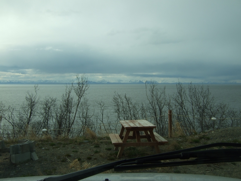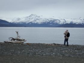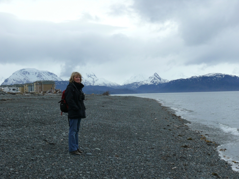 Nach einem Strandspaziergang, den wir wegen der ansteigenden Flut abbrechen müssen, stärken wir uns beim Lunch im Café Veronica, und auf der Kalifornsky Road geht es dann weiter am Cook Inlet entlang Richtung Homer. Leider versperren immer wieder Bäume den Blick auf Meer und Berge.