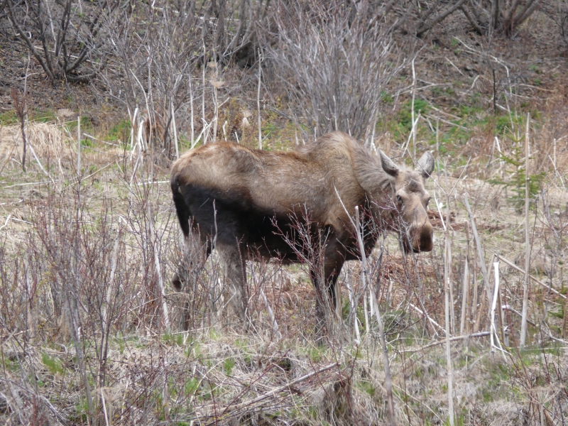Ansonsten ist er eine relativ enge Straße, die fast durchgehend bewohnt ist. Wir bemerken es wieder an den Briefkästen - und daran, dass plötzlich eine Elchkuh am Straßenrand steht. Zahlreicher wird das Wild dann noch in den Vororten von Anchorage. Eine Elchkuh trabt auf dem Gehweg neben dem Auto her, und eine andere läuft uns aus einem Wäldchen heraus direkt vor die Stoßstange. Eine weitere wartet lieber im Gebüsch, bis wir weg sind. Und auf dem Campground, auf dem wir unsere letzte Nacht in Alaska verbringen wollen, ist gerade Bärenalarm! Man muss nur in die Städte fahren, um das Wildlife genießen zu können ...