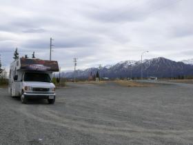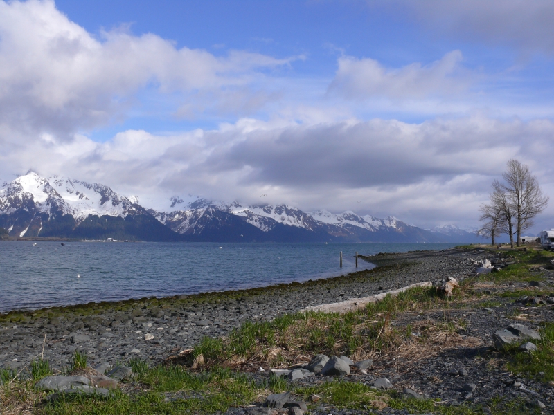 Wir fahren nun weiter nach Seward. Und nachdem die nötigen Verrichtungen (tanken, dumpen, Wassertank auffüllen) erledigt sind, finden wir am Strand einen schönen Platz zum Übernachten - wieder mit tollem Blick über Meer und Berge.