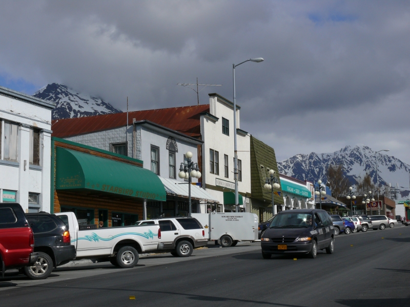 Vor Abfahrt des Bootes haben wir noch Zeit, den Ort anzuschauen, d.h. die Touristenmeile von Seward. Außer uns sind auch einige Leute von dem Kreuzfahrtschiff unterwegs, das in der Nacht oder am späten Abend in den Hafen eingelaufen ist.