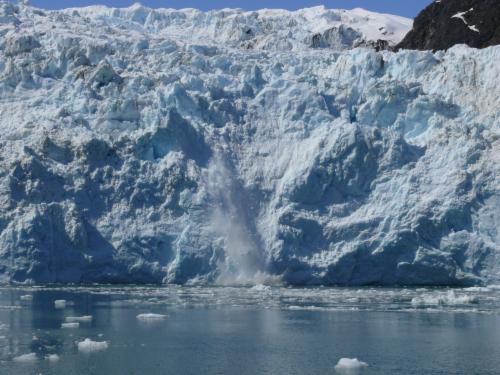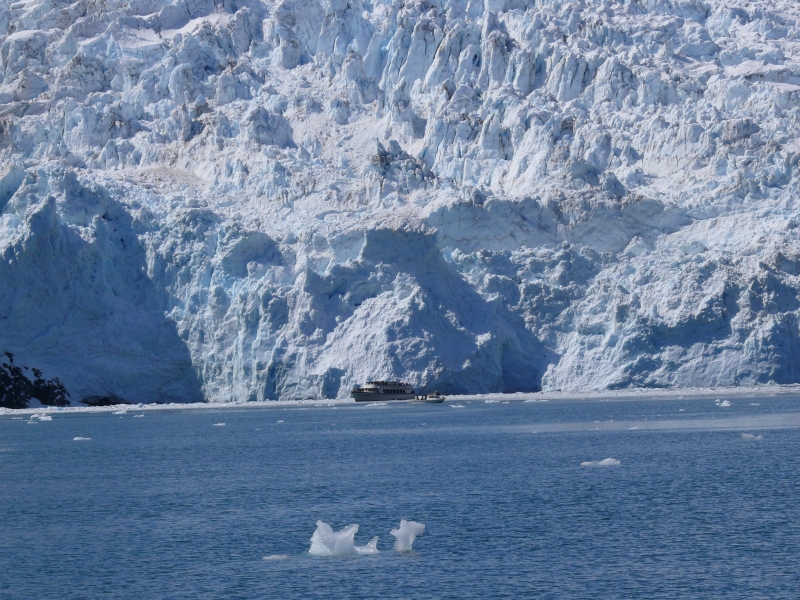 Die Route führt uns durch die Resurrection Bay vorbei am Bear Glacier und am Aialik Cape in die Aialik Bay. Hier münden gleich drei Gletscherzungen des Harding Icefields ins Meer. Der spektakulärste ist der Holgate Glacier, an den wir ganz nah heran fahren. Die Szenerie ist grandios und atemberaubend. Tatsächlich spüren wir so etwas wie Ergriffenheit vor dieser majestätischen Kulisse. Wir sind schon an vielen Orten auf dieser Welt gewesen. Wir haben traumhafte Dinge gesehen und sind durch fantastische Landschaften gefahren. Oft schon haben wir gedacht: Hier ist es so schön, das ist nicht mehr zu überbieten. Aber vor der Erhabenheit der Bergkulisse im Kenai Fjords National Park verblasst alles, was wir bisher kennengelernt haben. Der Eindruck ist mit Worten kaum zu beschreiben. Wir stehen Stunde um Stunde im schneidend kalten Wind - trotz strahlendem Sonnenschein ist es eisig hier draußen auf dem Meer - und versuchen, all dieses in uns aufzunehmen.