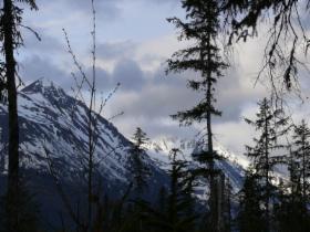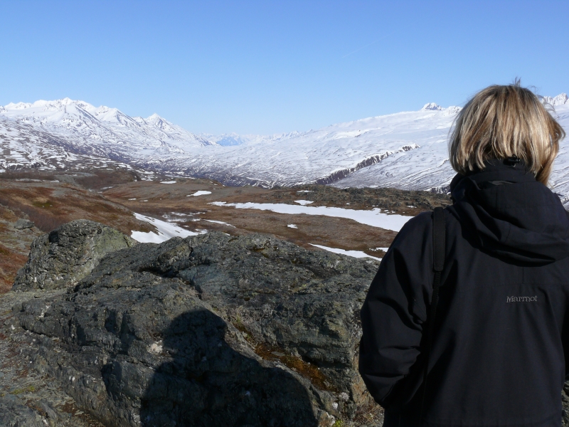 Nachdem wir einmal mehr die Grenze zwischen USA und Kanada passiert haben (Wir stellen dieses Mal unsere Uhren gar nicht um, schließlich bleiben wir nur einen Tag in Kanada.), geht es hinauf zum Chilkat Pass. Auch hier herrscht noch tiefster Winter. Obwohl der Pass nur etwas über tausend Meter hoch ist, wirkt die Gegend hochalpin.