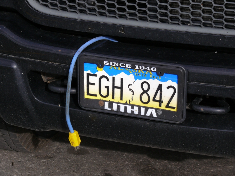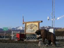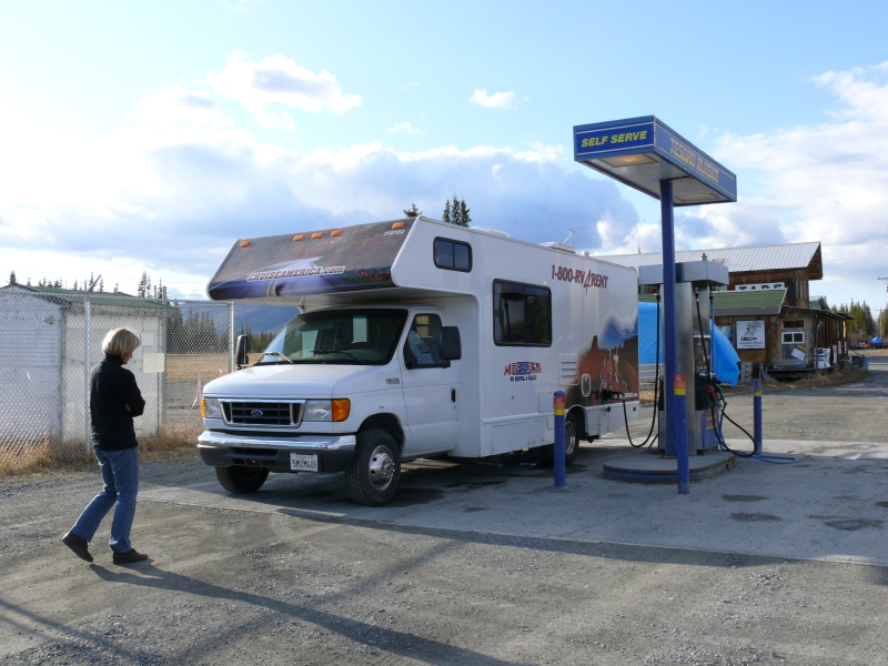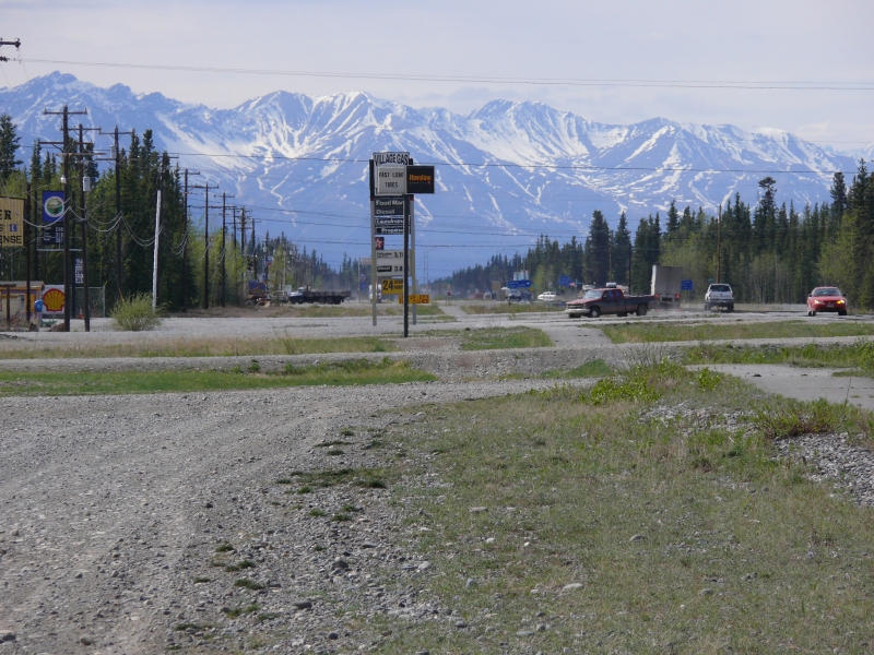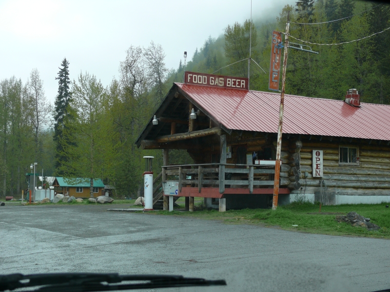 Beim Aufwachen tropft Regen auf das Autodach, und die Wolken hängen sehr tief, so dass wir während der Weiterfahrt keinen besonders weiten Blick haben. Wir sind hier im südlicheren Teil Alaskas. Alles ist schon viel grüner als weiter im Norden. Und es scheint auch zivilisierter, die Gegend wirkt recht "ordentlich". Die Häuser und Grundstücke sind gepflegter als die, die wir bisher gesehen haben. Aber Großstadt ist hier natürlich immer noch nicht: Die einzige Tankstelle im Umkreis von ca. 50 Meilen hat dienstags geschlossen - und heute ist (natürlich) Dienstag!