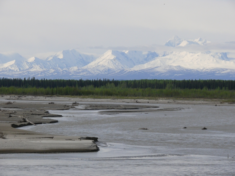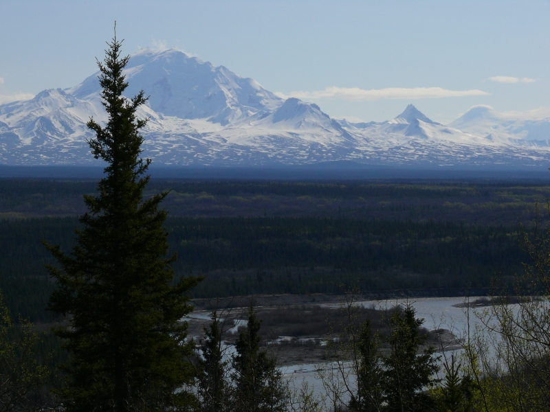 Zunächst müssen wir aber auf dem Richardson Highway noch ein Stück weiter nach Norden. Im Osten blicken wir auf die Wrangell Mountains mit ihren über 4000 m hohen Gipfeln.