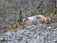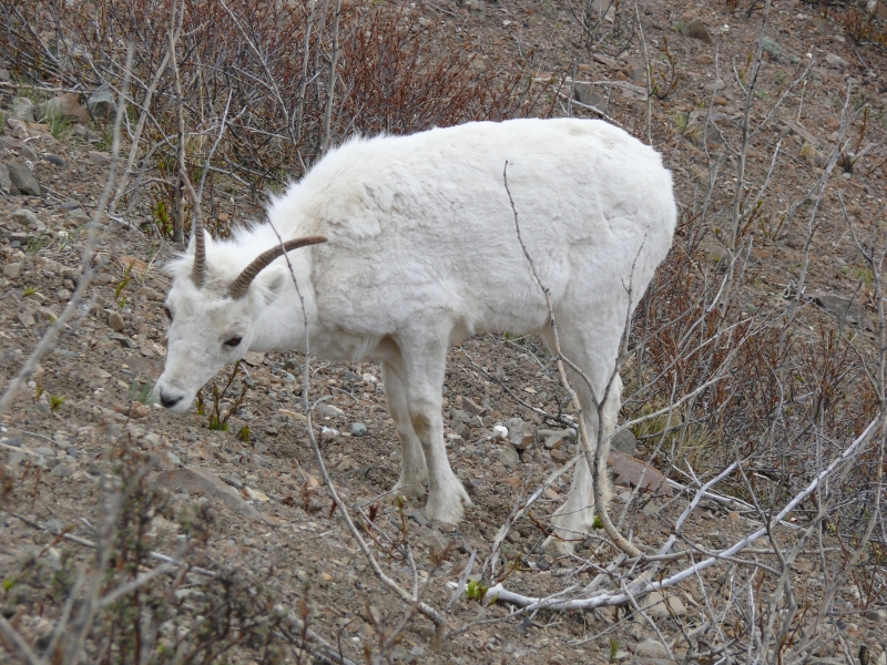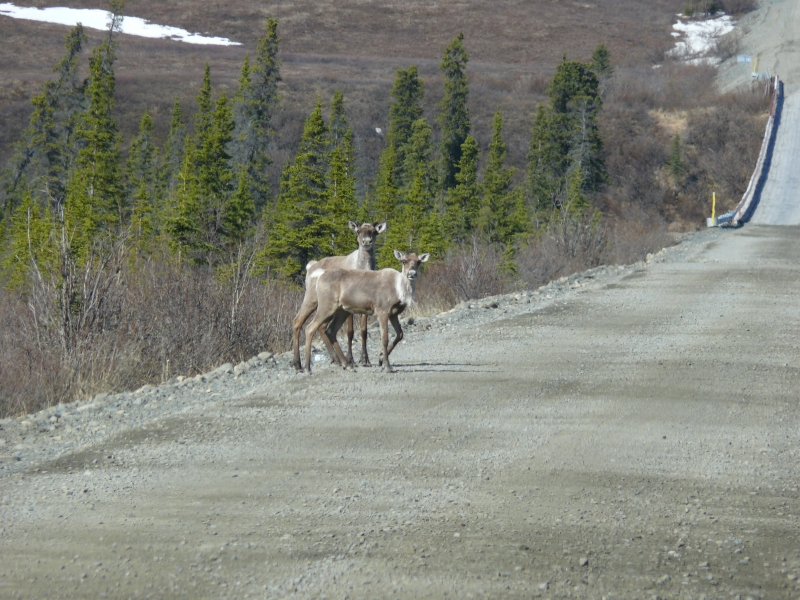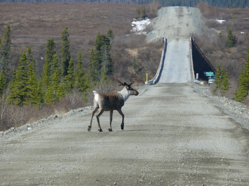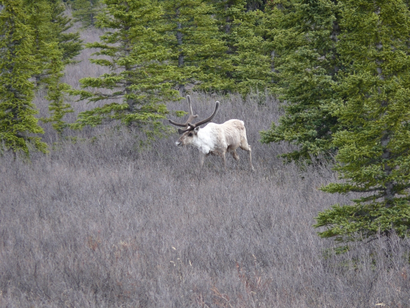 Ansonsten ist die Strecke eher langweilig. Wir halten ständig Ausschau nach Tieren, aber meist ohne Erfolg, sieht man einmal von den kleinen Hasen (Snowshoe-Hares) ab, die offensichtlich nicht nur ganz Alaska, sondern auch den Yukon bevölkern. Highlight ist ein Waipitihirsch, den wir in einiger Entfernung an einem Hang entdecken.