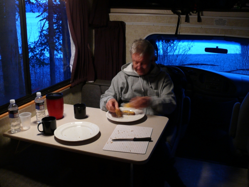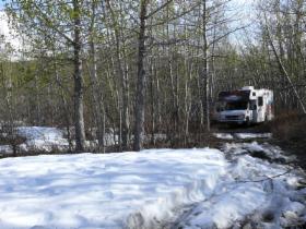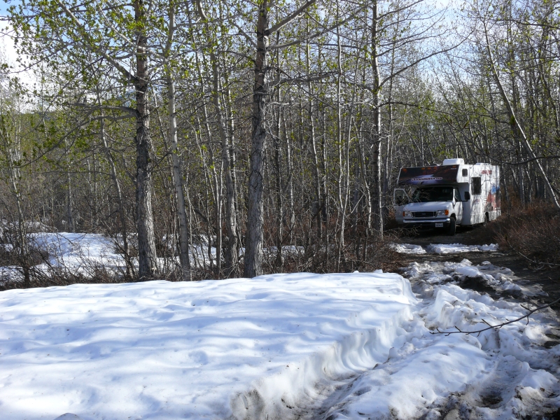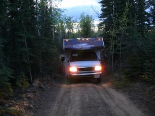 Ansonsten bietet der Klondike Highway keine Attraktionen. Er führt durch endlose Fichtenwälder, von denen zudem weite Teile verbrannt sind. Aber wir kommen gut vorwärts. Als wir den Stewart River überqueren, ist es schon 22.30 Uhr. Wir fahren in Ulrichs Geburtstag hinein, und genau um Mitternacht quälen wir uns mit dem RV gerade durch einen Weg, auf dem wir einen netten Übernachtungsplatz an einem See zu finden hofften, der dann aber doch zu eng und zu schlammig für die Weiterfahrt wurde.