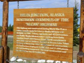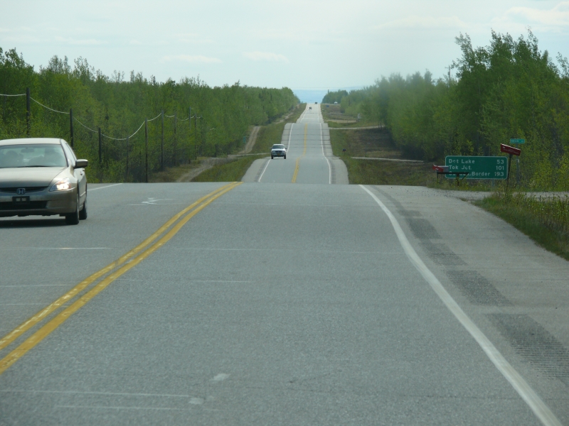 Für uns beginnt er hier, und auf den ersten Meilen zieht er sich stur gerade durch die Landschaft. Bis Tok gibt es nur wenig Kurven, dafür umso mehr "Bodenwellen". Aber ein autobahnmäßig ausgebauter Alaska Highway wäre nur noch halb so schön.