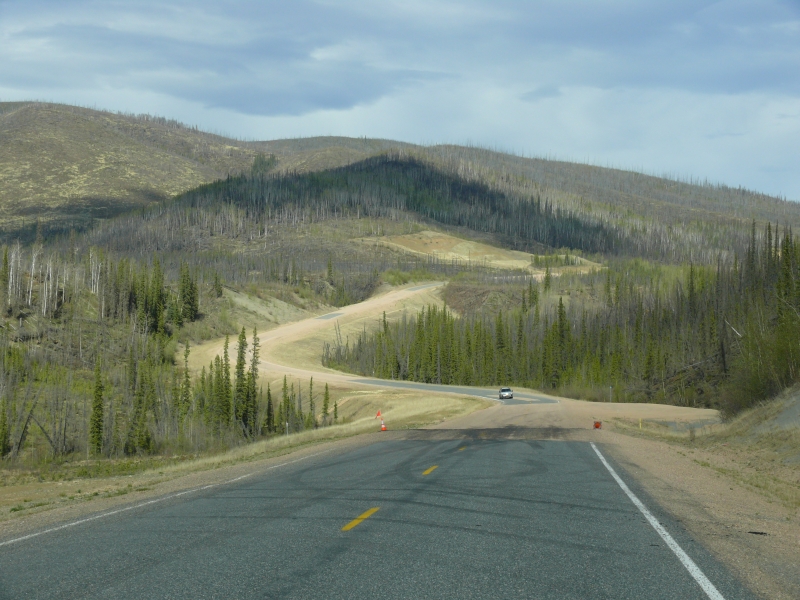 Immer dann, wenn wir durch bewaldetes Gebiet fahren, sehen wir Spuren großer Waldbrände, so auch hier. Obwohl Alaska und der Yukon, in den wir morgen kommen werden, keine besonders trockenen Gebiete sind, gehen doch immer wieder riesige Waldflächen in Flammen auf. Meist sind es Blitze, die diese Feuer verursachen. Und es dauert immer viele Jahrzehnte, bis sich in dieser Gegend die Natur von solcher Zerstörung erholen kann: Die Humusschicht über dem Permafrostboden ist nur sehr dünn und die Vegetationsperiode ist äußerst kurz – nicht unbedingt optimale Bedingungen für Pflanzen.